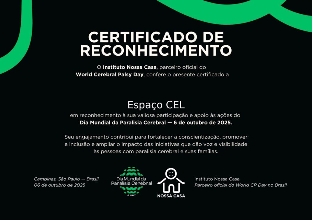 O Instituto Nossa Casa, parceiro oficial do WCP DAY, conferiu ao Espaço CEL um certificado**,** em reconhecimento à nossa participação e apoio às ações do Dia Mundial da Paralisia Cerebral, contribuindo para fortalecer a conscientização, promover a inclusão e ampliar o impacto de iniciativas que dão voz e visibilidade às pessoas com paralisia cerebral e suas famílias.