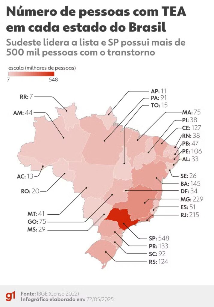🔎 O Censo Demográfico considera alunos com TEA regularmente matriculados na rede de educação. Ele não leva em conta a qualidade do ensino que esses alunos recebem em sala de aula.